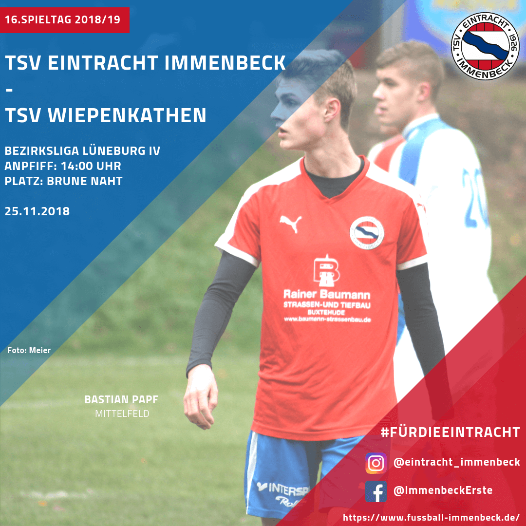Für unser Team aus Immenbeck sind die Heimspiele sehr wichtig. Hier ist die Mannschaft auch gegen überlegene und favorisierte Teams immer in der Lage zum Stolperstein zu werden. Auch gegen Wiepenkathen will die Eintracht unangenehm sein, selber Gefahr entwickeln und dann wird man sehen, was unterm Strich steht. Personell sieht es weiterhin eng aus. Viele angeschlagene und verletzte Spieler machen die Auswahl für die Coaches Wiede und Lünsmann leicht, nicht unbedingt optimal. Dennoch darf die Mannschaft zuversichtlich sein, denn die Partien gegen Wiepenkathen sind fast immer eng und umkämpft. Letzte Saison brauchte es die 94. Minute für den Wika-Ausgleich. Laut Coach Wiede wäre man auch einfach mal dran, selbst wenn es ein glücklicher Erfolg sein würde. Nichtsdestotrotz wird die Eintracht mit allem, was möglich ist Zuhause aufschlagen und das letzte Heimspiel des Jahres 2018 genießen. Wir freuen uns auf eine trotz angekündigter Kälte volle Brune Naht. Lasst uns das Jahr stimmungsvoll und positiv abschließen. Für die Eintracht!